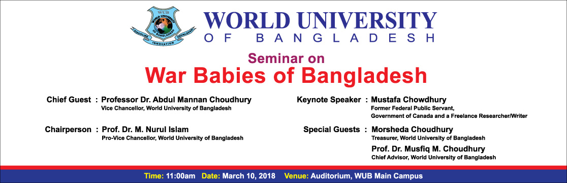 We are pleased to inform you that Mr. Mustafa Chowdhury, a Former Federal Public Servant, Government of Canada and a Freelance Researcher/Writer will deliver a lecture on War Babies of Bangladesh on March 10, 2018 at 11:00 A.M at the auditorium of the main campus of World University of Bangladesh (WUB). Prof. Dr. Abdul Mannan Choudhury, Honorable Vice Chancellor of the university has given his kind consent to grace the occasion as chief guest while Morsheda Choudhury, Treasurer, WUB and Prof. Dr. Musfiq M. Choudhury, Chief Advisor, WUB will be present as special guests. The program will be presided over by Prof. Dr. M. Nurul Islam, Pro-Vice Chancellor of the university.
