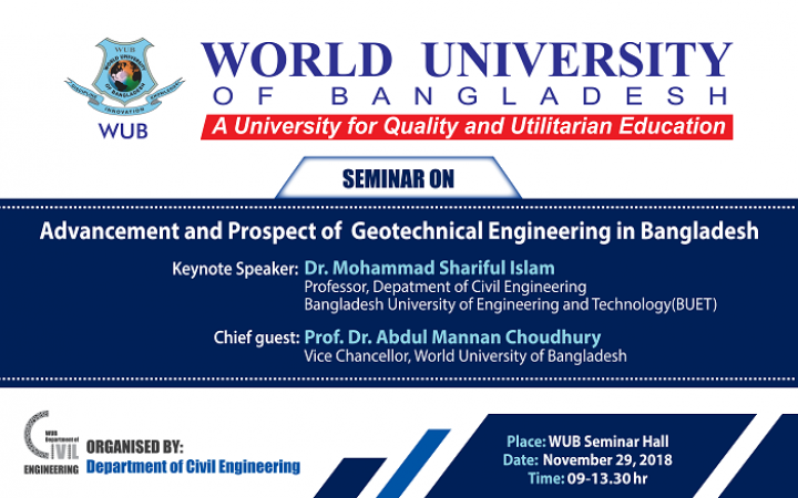 Department of Civil Engineering, World University of Bangladesh is going to organize a Seminar on ‘The advancement and Prospect of Geotechnical Engineering in Bangladesh’ on Thursday, 29th November, 2018. We are fortunate to have Dr. Mohammad Shafirul Islam, Professor, Department of Civil Engineering of BUET as the Keynote speaker.